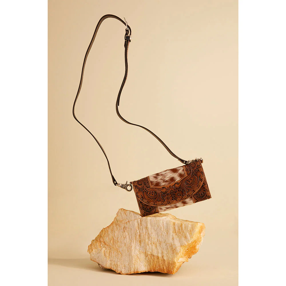 Crafted with hairon cowhide and beautifully hand-tooled leather, this piece showcases intricate floral carving framed by natural cowhide panels — meaning every bag is truly one of a kind. The detachable strap allows you to wear it as a crossbody or carry it as a statement wallet, giving you versatility without compromising on style.